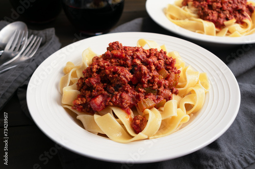 Close-up of a Bowl of Authentic Bolognese Sauce Served Over Pappardelle: Ragu alla bolognese Italian tomato and meat sauce over wide pasta noodles