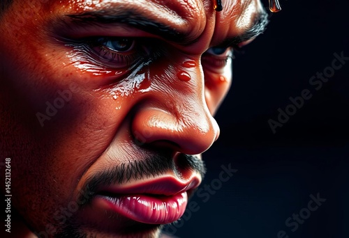 Close-up of a boxer's face, sweat dripping, intense expression, fitness, resilience