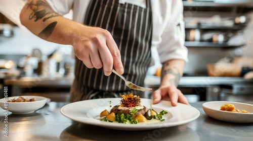 Close-up of a chef plating a gourmet dish in a professional kitchen, wearing a striped apron. The dish features finely arranged ingredients and garnishes.