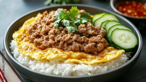 Close-up of a delicious omelette with minced pork, served on top of steamed rice, with chili sauce and fresh cucumbers on the side.