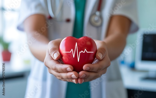 Close-up of a doctor's hands holding a red heart with a white electrocardiogram line, symbolizing cardiology and heart health, with a blurred background representing a medical environment
