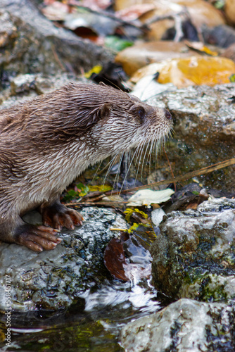 Close-up of a European otter on the rocks of a river (Lutra lutra lutra).