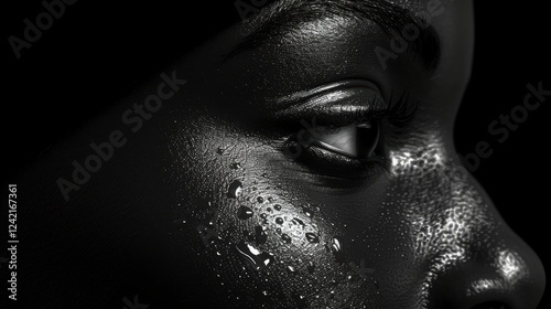 Close-up of a Face with Water Droplets on Skin, Showcasing Texture and Light Reflection in High-Contrast Black and White Composition