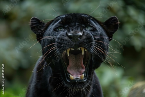 Closeup of a fierce black panther with bared teeth, growling in the wild
