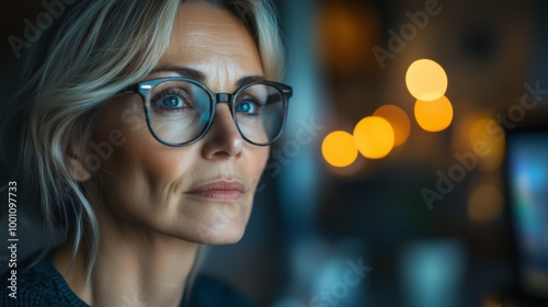 Close-Up of a Focused Mature Woman With Glasses Working in a Dimly Lit Office