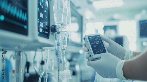 Close-up of a futuristic blood glucose monitor attached to a persons arm in a tech-focused medical environment with clean lines and modern equipment