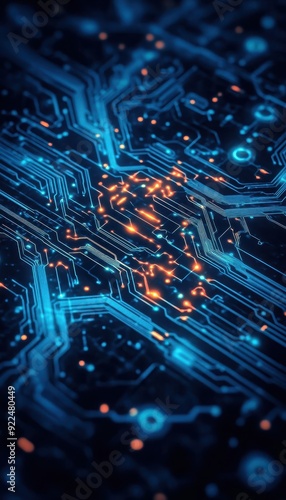 Close-up of a futuristic circuit board with glowing blue and orange lights, representing advanced technology and digital connectivity.