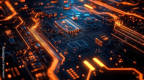 Close-up of a futuristic computer circuit board with glowing orange pathways and electronic components emitting blue and orange light, conveying advanced technology and digital innovation