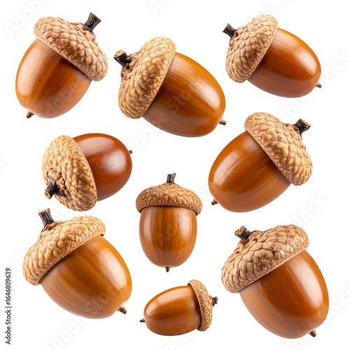 Close-up of a group of brown acorns isolated against a white background, highlighting the details of these natural autumn seeds