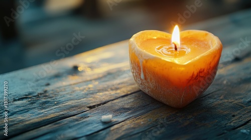 Close-up of a heart-shaped candle placed on a rustic table with soft natural lighting, detailed and inviting, warm and romantic