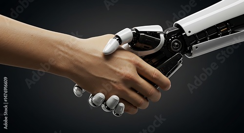 Close-up of a humanoid robot shaking hands with a human – realistic, high contrast lighting