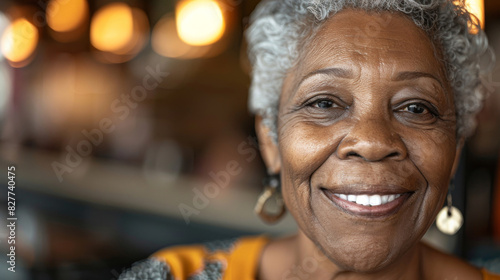 Close-up of a joyful elderly woman with a bright smile, indoors with soft lighting
