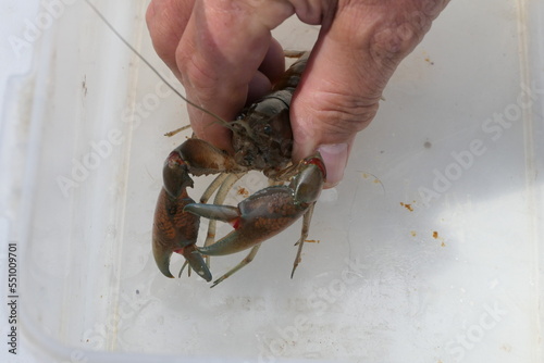 Closeup of a large Cherax Destructor, the Common Australian Yabby, being hand held.