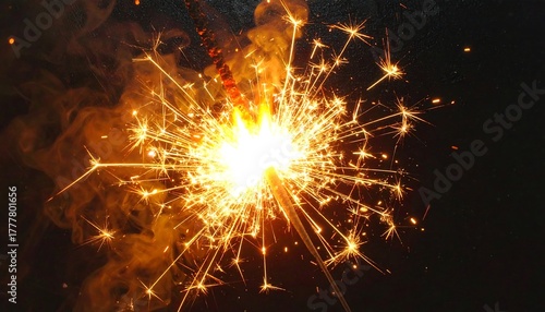 Close-up of a lit, vibrant sparkler emitting bright light and smoky trails, against a dark background