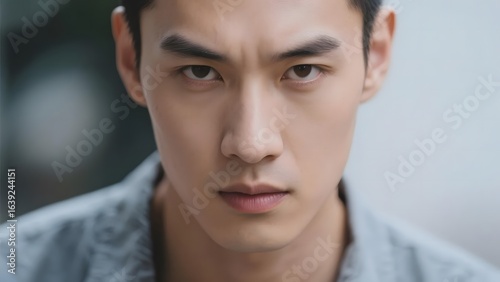Close-up of a man with a serious expression, wearing a patterned shirt.