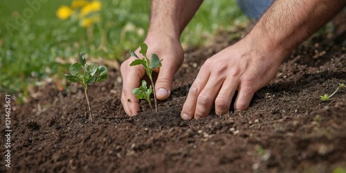 Close-up of a man's hands planting a tree seedling in the soil. Gardening concept, greening the planet. Environmental protection.