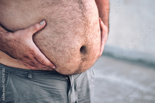 Close-up of a man's round and full hairy belly, with both hands holding it up