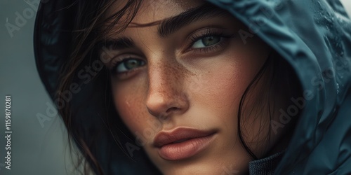 Close-up of a model wearing a hooded waterproof windbreaker with heat-sensitive fabric that shifts colors in ambient lighting