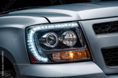 Close-up of a modern SUV headlight assembly. LED ring accents the headlight. Silver-toned vehicle