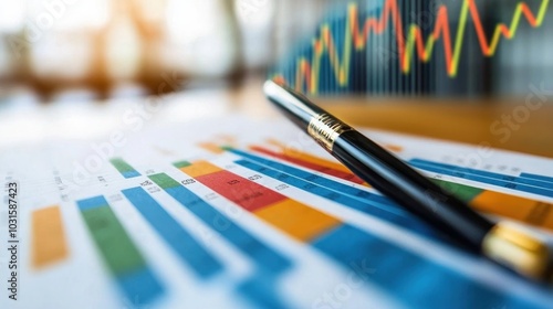 Close-up of a pen on financial data sheets with colorful charts and graphs, representing analysis and business strategy.