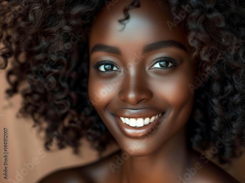 close-up of a person with dark skin and voluminous curly hair against a softly lit warm brown background
