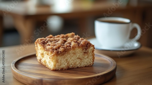 Closeup of a piece of cinnamon swirl crumb cake and coffee cup on a wooden plate : Generative AI