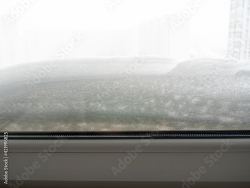 close-up of a plastic window in the house. There's a lot of snow on the back side. The concept of a snow storm, inclement weather, winter