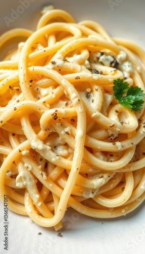 Close-up of a plate of creamy fettuccine Alfredo, carb, tasty