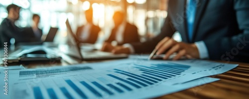 Close-up of a professional analyzing data on a document with graphs and charts in a modern office setting.
