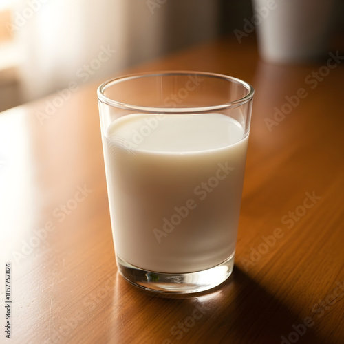 Close-up of a refreshing glass of fresh white milk on a rustic wooden table, illuminated by soft morning light, perfect for healthy breakfast concepts.