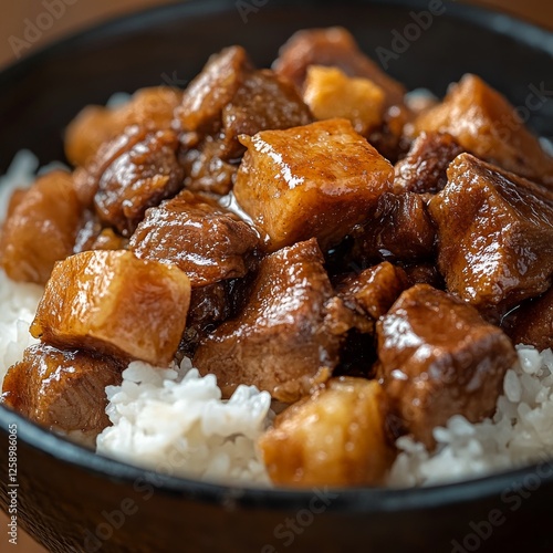 Close-up of a rice bowl with Filipino adobo and rice. Featuring a savory and tangy dish. Highlighting the texture and flavors of the adobo. Ideal for food and cultural themes.