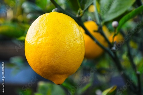 Close-up of a ripe lemon hanging on a tree branch with blurred green leaves in the background.