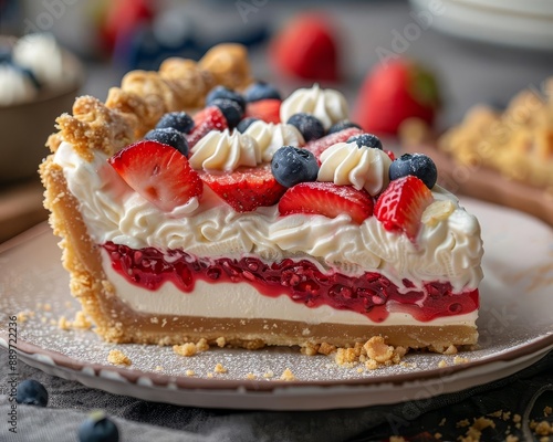 Closeup of a slice of pie with red, white, and blue filling