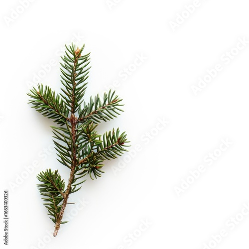 Close-up of a small evergreen branch against a white background. Tiny, needle-like leaves are clustered along slender branches. Simple, natural, and minimalist aesthetic
