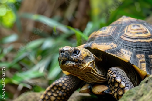 Close-up of a tortoise relaxing in its natural habitat, showcasing intricate shell patterns and focused expression under a greenery backdrop