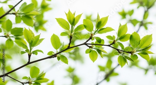Close-up of a tree branch with vibrant green leaves against a bright background