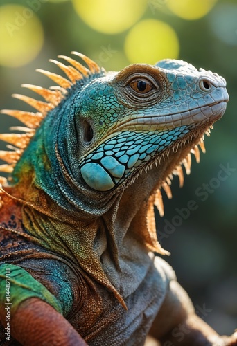 Closeup of a vibrant iguana with its mouth open, showcasing its colorful scales