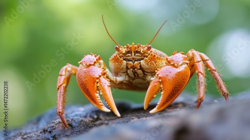 Closeup of a vibrant orange crab, showcasing its detailed claws and textured carapace, perched on a dark rock against a blurred green background. : Generative AI