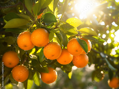 Close-up of a vibrant orange grove with citrus fruits hanging from the branches. Orange farm where the fruits are ready to be picked.