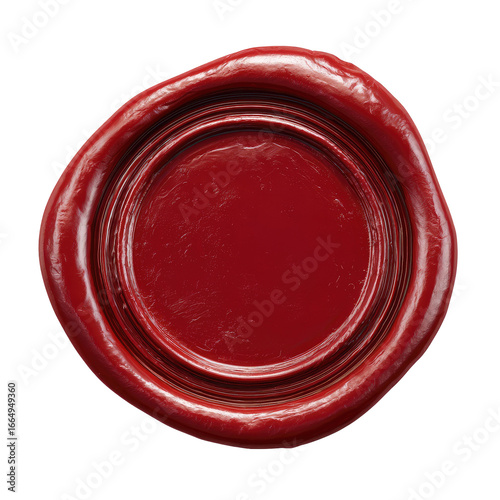 Close-up of a vibrant, round, red wax seal. A deep crimson, glossy seal, with a detailed, sculpted rim, sits against a black background. The seal's surface exhibits subtle texture