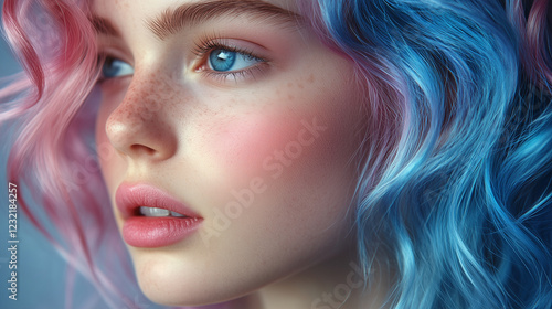 Close-Up of a Woman with Shiny pastel colorful Wavy Hair – Perfect for Beauty, Haircare, and Fashion Advertisements, Salon Branding, and Cosmetic Product Promotions