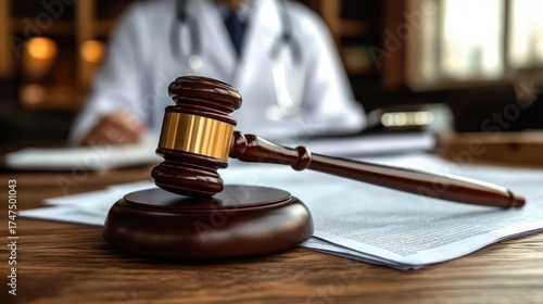 Close-up of a wooden judge gavel resting on a sound block with legal documents and a person in a white coat with a stethoscope in the background, conveying judgment and medical legal context