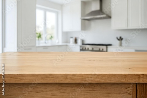 Close-up of a wooden kitchen countertop with a modern, airy kitchen in the background featuring white cabinets and stainless steel appliances.