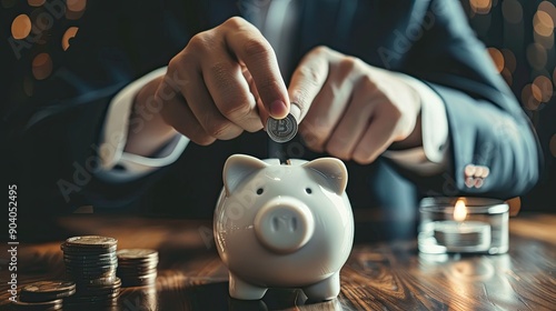 Close-up of a young businessman's hands inserting a coin into a piggy bank, demonstrating a commitment to building wealth.