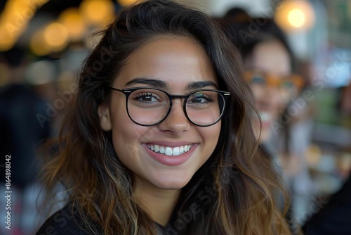 Close-up of a young businesswoman laughing with her eyeglasses-wearing colleague.