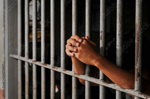 Close-up of an inmate’s hand holding prison bars in a dark cell. Concept of imprisonment, punishment, confinement, and criminal justice.