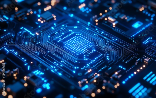 Closeup of an intricate blue circuit board with pulsating electric blue pathways, representing advanced digital networks, cyberpunk aesthetic, ultrarealistic, highdefinition