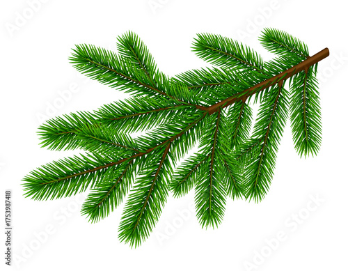 Closeup of an isolated green Christmas fir branch with needles and decoration for the winter holiday season