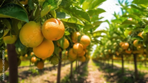 close-up of an orange tree with ripe oranges hanging from the branches.
