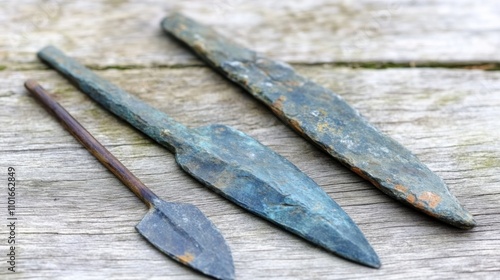 Close-up of ancient stone tools, sharp flint knives, and polished axes on a weathered wooden surface, symbolizing prehistoric craftsmanship and the dawn of human ingenuity